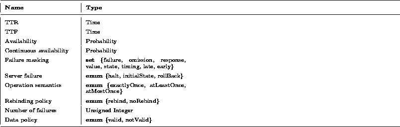 The failure masking dimension is used to describe what kind of failures a server may expose to its clients. A client must be able to detect and handle any kind of exposed failure. The above table lists the set of all possible failures that can be exposed by services in general. The QoS specification for a particular service will list the subset of failures exposed by that service.