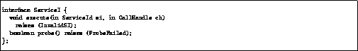 We will now present simplified versions of three main interfaces in the design. The ServiceI interface provides an operation, called execute , to start the execution of a service. The service identifier is obtained from a table that maps phone numbers to services. The CallHandle