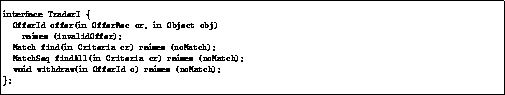 We can relax the performance requirements for the offer and withdraw operations on the Trader . The reason being that these operations are not time critical from the service execution point of view. We specify the performance in Figure 26 as part of the TraderProfile_P profile.