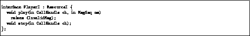 Finally, we have the PlayerI that represents a simple player resource. Players allow us to play a sequence of messages on the connection associated with the supplied CallHandle . The idea is that a complete message can be built up by a sequence of smaller phrases. The interface allows the service executor to interrupt the playing of messages by calling stop .