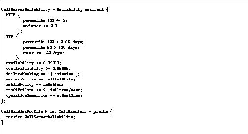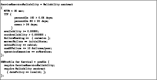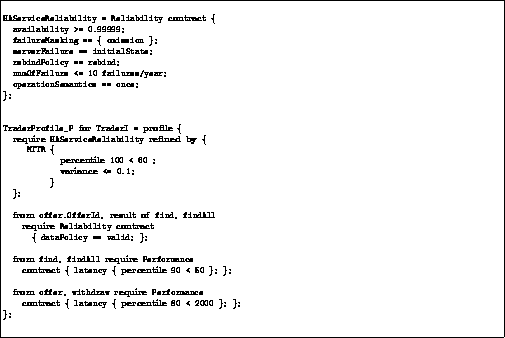 (Figure 26 ) is based on a general contract ( HAServiceReliability ) for highly-available services. The contract is abstract in the sense that it only states the availability requirements and leaves several of the other dimensions unspecified. The Trader profile refines it by stating that the recovery time should be short.