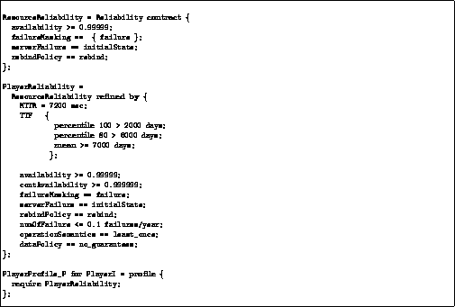 In Figure 25 we define a general contract, called ResourceReliability , for ResourceI . The contract captures that resources need to be highly available. Each specific resource type---such as PlayerReliability ---will then refine this general contract to specify its individual QoS properties.