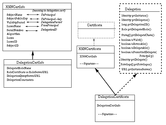 An intermediate may also explicitly enable delegation using the AccessController methods enableSimpleDelegation() and enableCascadedDelegation(). The specified delegation mode is taken into account when privileges of the intermediate need to be presented to consecutive objects in the method invocation chain. Whether the intermediate's privileges are combined with the delegator's is based on the mode of delegation. The system can obtain the security requirements attached to any remote reference. The delegation, if required by the specified requirements (and target object is thus willing to act as a delegate), is activated appropriately from the context. Using the context of invocation, delegator's AccessControler determines the CodeExecutor who is executing client's code. This CodeExecutor becomes the Signer of a delegation certificate, and thus effectively the initiator of a delegation.