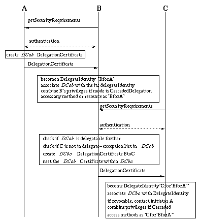 When an object decides to delegate a task to another object (effectively to the CodeExecutor of that object), it creates a delegation certificate. This certificate specifies the initiator, role it is delegating, any constraints that are bound to the delegation, a nonce, validity period and its DelegationServer name for handling queries regarding delegation revocation. A role certificate is associated with the role being delegated, which might contain a set of privileges associated with it.