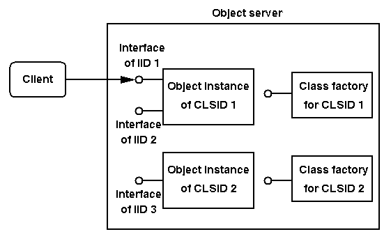 Figure 1. COM server, classes, objects, interfaces and client.