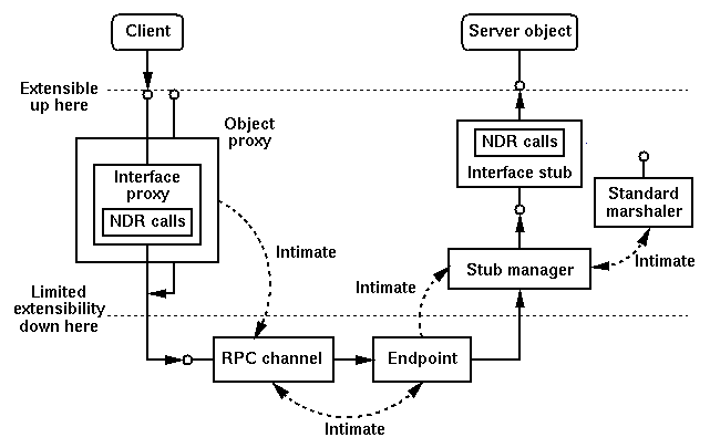Once the standard remoting architecture is established, the client can make calls through the obtained pointer. Each call first enters a proxy, gets appropriately marshaled in the Network Data Representation (NDR) format [DCE95], sent by the channel object to the server endpoint, dispatched by the stub manager, gets unmarshaled by an interface stub, and finally delivered to the server object. Since the entire process is a sequence of local and remote function calls, the reply is done by simply returning from those function calls and reversing the marshaling procedure. An object can declare that it wants to implement custom marshaling by supporting the IMarshal interface. In this case, the standard remoting architecture is not created. Instead, the object specifies (or itself acts as) a custom marshaler that is responsible for constructing custom OBJREFs and specifying the CLSID of a custom unmarshaler to be activated at the client side to receive the OBJREFs. The custom unmarshaler can create (or itself act as) a custom proxy that does application-specific processing and uses a application-specific communication mechanism to interact with the server.3. Extensible Remoting Architecture 3.1. Extensibility issues in current COM remoting architecture Custom marshaling provides the basis for extensibility in COM remoting architecture. Applications can achieve stronger low-level system properties by plugging in their own custom remoting architecture without having to modify the source code of the standard one. However, most such applications do not want to rebuild the entire remoting architecture; instead, they often want to reuse existing architecture as much as possible and replace only those parts that are specific to them. For example, very few applications need to replace the interface proxies and stubs that do marshaling and unmarshaling; some applications need to replace only the client-side architecture, while some need to modify only the server-side architecture. The examples described in the next section illustrate these different requirements.The above discussion motivates the concept of a componentized remoting architecture. In addition to providing the infrastructure for higher-level componentized applications, if the remoting architecture itself is also componentized, then the benefits of software reuse can also be realized at the lower level. Figure 2 shows that current COM remoting architecture is partially componentized: the proxies, channels, stubs, and marshalers are COM components, but the server endpoints and stub managers are not. This limitation makes it hard to replace the transport and to control the IPID assignment and call dispatching. The second limitation is a result of the intimacy between object proxy and channel object. Although they interact through COM interfaces, this intimacy makes it hard to replace one of them without replacing the other. Specifically, the CLSID of the standard RPC channel object is not published, so it is hard for a custom proxy to connect to a standard channel. Also, the object proxy always creates and connects to a standard channel, so it is hard to reuse the object proxy while replacing the channel object.Figure 2 illustrates the strength and the weakness of current COM remoting architecture in terms of extensibility. Basically, the architecture is extensible only at the upper layer where it interfaces to the client and the server applications. Applying custom marshaling at this layer is usually called semi-custom marshaling (or handler marshaling) as it essentially builds custom marshaling on top of standard marshaling. An arbitrary number of components connected in an arbitrary way can be inserted between the server object and the interface stubs as part of the interface pointer marshaling process. Such extensibility is useful for parameter tracing and logging, input value checking, etc. Similarly, arbitrary components can be inserted between the client and the proxies as part of the interface pointer unmarshaling process. This can be an ideal place for data caching logic, for example. In contrast, current COM remoting architecture has limited flexibility for applications that require extensibility at the lower layers. For example, fault tolerance mechanisms often need to get access to call parameters in their marshaled format for efficient logging or replication. Currently, that would require rebuilding the entire remoting architecture.