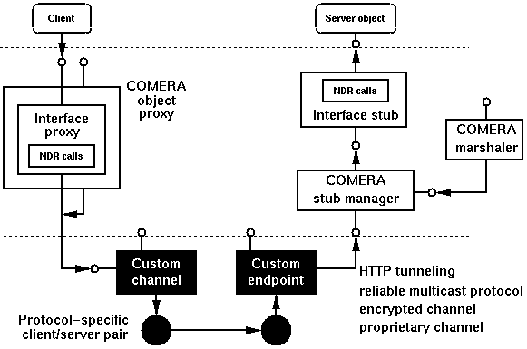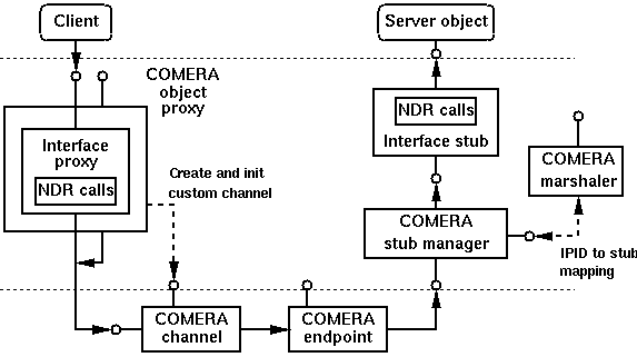 3.2. The COMERA architecture We propose a new architecture called COMERA (COM Extensible Remoting Architecture) to address the above issues. Our approach is to first use custom marshaling to rebuild the standard remoting architecture, and then redesign parts of it to enhance extensibility. Figure 3 shows the overall COMERA architecture. Since the original interface proxies and stubs are packaged as binary COM objects, COMERA can reuse them without requiring a new IDL compiler or any recompilation. COMERA improves upon current COM remoting architecture in the following aspects: