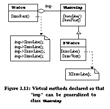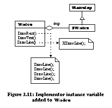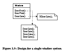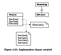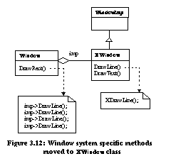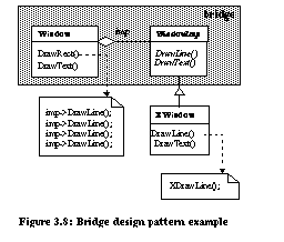 ![]() ![]() BridgeBridge decouples an abstraction from its implementation so that the two can vary independently. In the example from [Gam95] (Figure 3.8), the Window abstraction and WindowImp implementation are placed in separate hierarchies. All operations on Window subclasses are implemented in terms of abstract operations from the WindowImp interface. Only the WindowImp hierarchy needs to be extended to support another windowing system. We refer to the relationship between Window and WindowImp as a bridge because it bridges the abstraction and its implementation, allowing them to vary independently. ![]() Refactorings can be used to install a bridge design pattern given a simple design committed to a single window system. Figure 3.9 depicts a system designed for X-Windows. This system can be evolved with refactorings to use the bridge design pattern in seven steps: ![]()