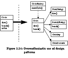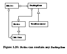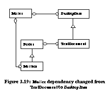 The Bridge architecture uses object composition to provide needed flexibility. Object composition is also present in the Builder and Strategy design patterns. The trade-offs between use of inheritance and object composition are discussed in [Gam95, pp. 18-20]. Refactorings allow a designer to safely migrate from statically checkable designs using inheritance to dynamically defined designs using object-composition. Role of Refactorings for Design PatternsGamma et. al. note that a common design pattern pitfall is overenthusiasm: "Patterns have costs (indirection, complexity) therefore [one should] design to be as flexible as needed, not as flexible as possible." The example from [Gam96] is displayed in Figure 3.14. Instead of creating a simple Circle class, an overenthusiastic designer adds a Circle factory with strategies for each method, a bridge to a Circle implementation, and a Circle decorator. The design is likely to be more complex and inefficient that what is actually required. The migration from a single Circle class to the complex microarchitecture in Figure 3.14 can be viewed as a transformation. This transformation is in fact automatable with refactorings5. Thus, instead of overdesigning, one can start with a simple Circle class and add the Factory Method, Strategy, Bridge, and Decorator design patterns as needed. ![]() Refactorings can restructure existing implementations to make them more flexible, dynamic, and reusable, however, their ability to affect algorithms is limited. Patterns such as Chain of Responsibility and Memento require that algorithms be designed with knowledge about the patterns employed. These patterns are thus considered fundamental to a software architecture because there is no refactoring enabled evolutionary path which leads to their use. Refactorings allow a designer to focus on fundamental patterns when creating a new software architecture. Patterns supported through refactorings can be added on an if-needed basis to the current or future architecture at minimal cost. Hot-Spot AnalysisThe hot-spot-driven-approach [Pre94] identifies which aspects of a framework are likely to differ from application to application. These aspects are called hot-spots . When a data hot-spot is identified, abstract classes are introduced. When a functional hot-spot is identified, extra methods and classes are introduced. Data Hot-SpotsWhen the instance variables between applications are likely to differ, Pree prescribed the creation of abstract classes. Refactorings have repeatedly demonstrated the ability to create abstract classes [Opd93, Tok95, Rob97]. As an example, Pree and Sikora provide a Mailing System case study [Pre95]. Figure 3.15 displays the initial state of its software architecture. In this system, Folder cannot be nested, and only TextDocument can be mailed. Their suggested architecture is displayed in Figure 3.16. Under the improved architecture, Folders can be nested and any subclass of DesktopItem can be mailed. Refactorings can automate these changes in five steps: ![]() ![]()