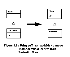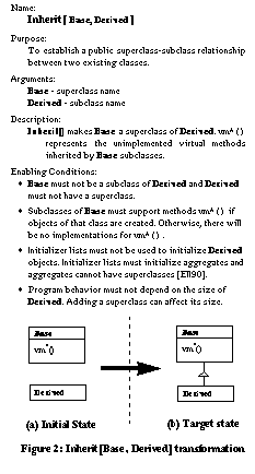 While motivations vary, the methods used for evolving architectures appear to follow regular patterns, particularly for object-oriented applications. Three kinds of object-oriented architectural evolution are: schema transformations, the introduction of design pattern microarchitectures, and the hot-spot-driven-approach. Schema transformations are drawn from object-oriented database schema transformations that perform edits on a class diagram [Ban87]. Examples are renaming a class, adding new instance variables, and moving a method up the class hierarchy. Design patterns are recurring sets of relationships between classes, objects, methods, etc. that define preferred solutions to common object-oriented design problems [Gam95]. The hot-spot-driven-approach is based on the identification of aspects of a software program which are likely to change from application to application (i.e. hot-spots ) [Pre95]. Architectures using abstract classes and template methods are prescribed to keep these hot-spots flexible. Refactorings are behavior-preserving program transformations which directly aid in the implementation of new architectures. Primitive refactorings perform simple edits such as adding new classes, creating instance variables, and moving instance variables up the class hierarchy. Compositions of refactorings can create abstract classes, capture aggregation and components [Opd92], extract template and hook methods, and even install design pattern microarchitectures [Tok95]. Although composing refactorings to achieve a desired result may require some planning, this effort is negligible compared to the manual task of identifying all lines of source code affected by a change, performing hand-edits, retesting all fixes, and risking the introduction of new errors. We are pursuing two approaches to promote refactoring research. The first is to evaluate refactorings of large applications. We believe that we are the first to provide empirical evidence on the usefulness of refactorings when applied to non-trivial applications [Tok99]. In one example, a major architectural change -- the splitting of a class hierarchy -- is automated2. In a second example on a large application (~500K LOCS), approximately fourteen thousand lines of code changes between two code releases are automated with refactorings. (See paper for details.) A second approach to promoting refactoring research is to demonstrate that common forms of architectural evolution can be automated. This paper catalogs the schema transformations, design pattern restructurings, and hot-spot meta patterns which can be automated with refactorings. By demonstrating broad coverage of common modes of evolution, it is argued that refactorings will be generally useful in the evolutionary maintenance cycle. A summary of the class diagram notation used throughout the remainder of this paper is presented in Figure 1. Within the main body of text, we use the following conventions: ![]() RefactoringsA refactoring is a parameterized behavior-preserving program transformation that automatically updates an application's design and underlying source code. A refactoring is typically a very simple transformation, one that has a straightforward (but not necessarily trivial) impact on application source code. An example is inherit [ Base , Derived ], which establishes a superclass-subclass relationship between two classes, Base and Derived , that were previously unrelated. From the perspective of an object-oriented class diagram, inherit merely adds an inheritance relationship between the Base and Derived classes, but it also checks enabling conditions to determine if the change can be made safely and it alters the application's source code to reflect this change. A refactoring is more precisely defined by (a) a purpose, (b) arguments, (c) a description, (d) enabling conditions, (e) an initial state, and (f) a target state. Such a definition for inherit [ Base , Derived ] is given in Figure 2. Applying refactorings is superior to hand-coding similar changes because it allow a designer to evolve the architecture of an existing body of code at the level of a class diagram leaving the code-level details to automation. ![]() Banerjee and Kim proposed a set of schema evolutions for evolving object-oriented database schemas [Ban87] and Opdyke proposed a list of primitive refactorings for object-oriented languages [Opd92]. Roberts implements many of these refactorings for the Smalltalk language [Rob97]. In addition to previous refactorings, we have found that transforming actual applications requires a larger set. We enlarged the set of schema evolutions to include, for example, substitute . Substitute changes a class' dependency on some class C to a dependency on a superclass of C [Tok95]. A second new set of refactorings is language-specific. Procedure_to_method and structure_to_class are used to convert C artifacts to their C++ equivalents. A third set supports the addition of design pattern microarchitectures in evolving programs [Tok95]. An example is add_factory_method which creates a method returning a new object and replaces all C++ invocations of " new Object " with a call to the method. This refactoring is used to add the Factory Method design pattern [Gam95]. A list of refactorings used in our research is presented in Table 1. Refactorings proposed in previous work are noted. Refactorings first implemented by our research for object-oriented software evolution appear in italics. ![]() Schema TransformationsThe database schema for an object-oriented database management system (OODBMS) looks like a class diagram for an object-oriented application. Similarly, OODBMS schema transformations have parallels in object-oriented software evolution. An example schema transformation is moving the domain of an instance variable up the inheritance hierarchy Figure 3.1. This transformation is supported by the refactoring pull_up_variable which moves an instance variable t