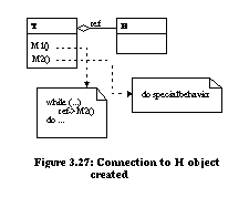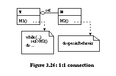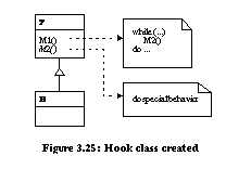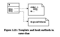 As a second example, we support the transition from unification to 1:1 connection (transition 2 from Figure 3.23). Consider the 1:1 connection meta pattern which stores the hook method in an object owned by the template class (Figure 3.26). Behavior can be changed at run-time by assigning a hook object with a different behavior to the template class. 1:1 connection can be automated in three steps using the unification pattern (Figure 3.21) as a starting point. ![]()