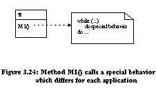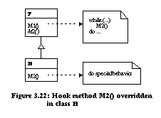 With the improved architecture, a Folder can be nested within another Folder and DesktopItem provides a superclass for adding other types of media to be mailed. These changes which would normally be implemented and tested by hand can be automated with refactorings. Functional Hot-SpotsFor the case of differing functionality, solutions based on template and hook methods are prescribed to provide the needed behavior. A template method provides the skeleton for a behavior. A hook method is called by the template method and can be tailored to provide different behaviors. Figure 3.21 is an example of a template method and hook method defined in the same class. Different subclasses of T can override hook method M2() which leads to differing functionality in template method M1() . (Figure 3.22). Pree identifies seven meta patterns for template and hook methods: unification, 1:1 connection, 1:N connection, 1:1 recursive connection, 1:N recursive connection, 1:1 recursive unification, and 1:N recursive unification [Pre94]. Refactorings automate the introduction of meta patterns into evolving architectures. The transitions between patterns enabled by refactorings are displayed in Figure 3.236. As examples, we demonstrate support for the first two transitions. ![]() ![]() ![]() In the unification composition, both the template and hook methods are located in the same class (Figure 3.21). The behavior of the template is changed by overriding the hook method in a subclass (Figure 3.22). An architecture with no template or hook methods can be transformed to use the unification meta pattern (transition 1 from Figure 3.23). Consider the class diagram in Figure 3.24 with class T having method M1() which calls some special behavior. A hook method can be added with refactorings in one step: ![]()