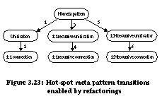 The behavior of template method M1() can now be altered dynamically by pointing to different hook class objects with different implementations of M2() . Other transitions in Figure 3.23 are similarly supported. Role of Refactorings for Hot-Spot AnalysisThe hot-spot-driven-approach provide a comprehensive method for evolving designs to manage change in both data and functionality. Pree notes that "the seven composition meta patterns repeatedly occur in frameworks." Thus, we expect an ongoing need to add meta patterns to evolving architectures. The addition of meta patterns is currently a manual process. Conditions are checked to ensure that a pattern can be added safely, lines of affected source code are identified, changes are coded, the system is tested to check for errors, any errors are fixed and the system is retested. Retesting continues until the expected likelihood of an error is sufficiently low. This section demonstrates that most meta patterns can be viewed as transformations from a simpler design. Refactorings automate the transition between designs granting designers the freedom to create simple frameworks and add patterns as needed when hot-spots are identified. Related WorkGriswold developed behavior-preserving transformations for structured programs written in Scheme [Gri91]. The goal of this system was to assist in the restructuring of functionally decomposed software. Software architectures developed using the classic structured software design methodology [You79] are difficult to restructure because nodes of the structure chart which define the program pass both data and control information. The presence of control information makes it difficult to relocate subtrees of the structure chart. As a result, most transformations are limited to the level of a function or a block of code. Object-oriented software architectures offer greater possibilities for restructuring. Bergstein defined a small set of object-preserving class transformations which can be applied to class diagrams [Ber91]. Lieberherr implemented these transformations in the Demeter object-oriented software environment [Lie91]. Example transformations are deleting useless subclasses and moving instance variables between a superclass and a subclass. Bergstein's transformations are object preserving so they cannot add, delete, or move methods or instance variables exported by a class. Banerjee and Kim identified a set of schema transformations which accounted for many changes to evolving object-oriented database schema [Ban87]. Opdyke defined a parallel set of behavior-preserving transformations for object-oriented applications based on the work by Banerjee and Kim, the design principles of Johnson and Foote [Joh88], and the design history of the UIUC Choices software system [May89]. These transformations were termed refactorings . Roberts developed the Smalltalk Refactory Browser which implements many of these refactorings [Rob97]. Tokuda and Batory proposed additional refactorings to support design patterns as targets states for software restructuring efforts [Tok95]. Refactorings are shown to support the addition of design patterns to object-oriented applications [Tok95, Rob97, Sch98]. Winsen used refactorings to make design patterns more explicit [Win96]. Tokuda and Batory demonstrated that refactorings can automate significant (greater than 10K lines of code) changes when applied to real applications [Tok99]. A number of tools instantiate a design pattern and insert it into existing source code [Bud96, Kim96, Flo97]. Instantiations are not necessarily refactorings, so testing of any changes may be required. Florijn and Meijers check invariants governing a pattern and repairs violations when possible. Refactorings do not have this pattern-level knowledge. SummaryArchitectural evolution is a costly yet unavoidable consequence of a successful application. One method for reducing cost is to automate aspects of the evolutionary cycle when possible. For object-oriented applications in particular, there are regular patterns by which architectures evolve. Three modes of architectural evolution are: schema transformations, the introduction of design pattern microarchitectures, and the hot-spot-driven-approach. Many evolutionary changes can be viewed as program transformations which are automatable with object-oriented refactorings. Refactorings are superior to hand-coding because they check enabling conditions to ensure that a change can be made safely, identify all lines of source code affected by a change, and perform all edits. Refactorings allow architectural evolution to occur at the level of a class diagram and leave the code-level details to automation. Architectures should evolve on an if-needed basis: