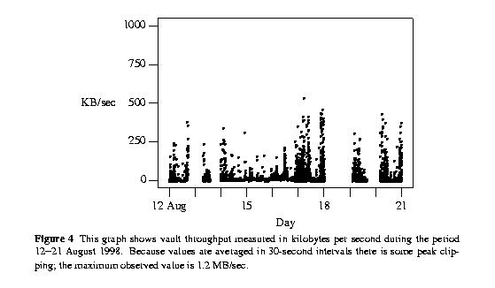 Our implementation uses 1024 bit PGP [4] for asymmetric key and DESX [5] for symmetric key encryption. Starting with Karn's DES implementation [6] we added both pre- and post-whitening steps for each block: DESXk.k1.k2(x) = k2 xor DESk(k1 xor x) DES encrypts 64-bit blocks, so this requires 64 + 56 + 64 = 184 bits of key material, and conservatively extends the effective key length of DES in our environment to at least 95 bits with respect to key search (in the sense of Kilian and Rogaway [5]), while adding a trivial amount of computation to each block encryption. (If an attacker could obtain all the plaintexts for all encrypted packets on a volume, and if the average packet length is 100 bytes, this would yield 6 million plaintext/ciphertext pairs. Rogaway's effective key length expression becomes 55 + 64 - 1 - log2(6 * 106) = 95 bits [7]. To hinder traffic analysis, we obscure source and destination addresses by substitution. A translation table mapping real to substituted addresses is encrypted with DESX using a translation table key KT unique to each volume. To speed up searches for specific conversations, a second table holds all pairs of translated addresses for which at least one conversation exists on the CD-ROM. The absence of a given pair of addresses in the second table means the CD-ROM contains no packets of that conversation, obviating an exhaustive search to establish this fact. Both translation tables are written to CD-ROM. A key is constructed for a given conversation by combining the concatenated, untranslated source and destination IP addresses with a 192-bit volume master key KV using exclusive-or, and then using DESX in CBC mode to encrypt a 192-bit constant with the combined value: KCi = DESXKV xor (SAi||DAi)(CONST) The resulting 192-bit conversation key Kci is used to encrypt packet payloads of the conversation: Ci = DESXKCi(Pi) A new volume master key and translation table key are generated for each volume. Currently, they are computed from previous keys: KVi+1 = DESXKVi(KVi) KTi+1 = DESXKTi(KTi) where KV0 and KT0 were randomly generated. This scheme does not exhibit good long-term randomness; we plan to replace this with a practically strong random data generator [8]. A new pair of PGP keys are generated per vault instance. The public key is used to seal the volume master and translation table keys before they are written to CD-ROM. Finally, we have built a rudimentary decryption engine that reconstructs all packet traffic stored on a CD-ROM given the private PGP key of the vault that created it. We have used the engine to verify the implementation of our cryptographic organization. 5. ExperiencesThe packet vault has been operational for the last year, irregularly collecting packets from a 10 Mbps Ethernet. The network is usually lightly loaded but there are periods when experimental video work causes traffic to exceed 70%. During the period 12-21 August 1998 we operated the vault continuously, collecting about 7.7 GB on 15 CDs. There were four interruptions of significant duration caused by vault failures during this period. Figure 4 shows a trace of the vault throughput.