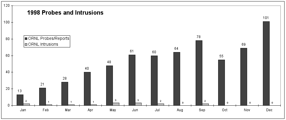 We think it is important for the security staff to have a good rapport with users. Users and system administrators should trust the security professionals and look to them for advice; users should be able to depend on the security professionals to keep them abreast of current attack methods and countermeasures. At ORNL, we need fast data collecting machines that are tightly controlled, with all unneeded services turned off. Encrypted communication is the only means of entry into these machines (except for console access). Our security staff is trained to use these encrypted channels correctly. We also need plenty of disk space for log files because we planned to keep at least one month's worth of data online. Policy DecisionsQ. What is the threat? A. We generally consider the users on our network to be "trusted." Our main concern is people outside our network trying to get into our network. Many of our users log in through their ISP (Internet Service Provider); from a conference floor; or from a remote network (e.g., at a collaborator's site) using insecure applications, such as telnet, ftp, or POP. Therefore, we have determined that our biggest threat is from authorized remote users who access our machines and have their login information sniffed at the remote site. Our second greatest threat is misconfigured or unpatched systems. We have several users that cannot (or do not want to) spend time/money to ensure the integrity of their machines, or they do not understand the threat and importance of keeping their machines secured. Our computers have been "hacked" because of "misconfigured" or unpatched systems. However, our decision to use a commercial security package, Internet Security Scanner (ISS), and to develop customized tools for checking for network vulnerabilities, have significantly reduced our vulnerabilities. An internal scan may show no vulnerabilities one day, but that is no assurance that a vulnerability will not be present the next day. For example, we scanned our address space for "named" service and notified appropriate system administrators of potential vulnerabilities. The day after that scan, one of our users rebooted his machine from Windows 95 to Linux, which was running an unpatched "named." That night our network was scanned by a remote site, and that machine was compromised via a buffer overflow in "named." Q. What can happen if an intrusion occurs? A. Possible problems for us include: 1. loss of data; Q. What should we watch for and what should our intrusion detection system report to us? A. Because our biggest security threat is legitimate users having their login information sniffed at a remote site, we need to watch for unusual activity for each user. For example, if a user typically logs in from Knoxville and suddenly logs in from Peru, we need to be notified. Likewise, if a user typically uses a computer for editing, compiling, and running FORTRAN programs, and suddenly begins using IRC (Internet Relay Chat), we need to be notified. Following the activity patterns of users requires monitoring the commands they issue, which meant a network keystroke logger was needed. Because port scanning is very popular and because we need to watch other network services (in addition to those that the keystroke logger picks up), it seemed prudent to detect incoming connection requests, which meant we also needed a "touch logger." These monitors do not usually provide real-time notification, so we use a third party Intrusion Detection System (IDS) which does provide real-time notification. We also knew that there would be times when we would have to monitor specific services and/or hosts (for "special case" needs), so we added an additional machine for this purpose. Q. What should we do if/when we suspect an intrusion? A. Possible actions are: 1. remove compromised machine from the network, Q. Should we report intrusions (and attempts), and to whom should we report them? A. We decided to report everything we determined to be "unfriendly activity." We report them to CIAC as well as to the registered administrator of the "attacking" subnet. We notify others as necessary, such as AUSCERT and EUROCERT. Our hope is that by notifying central security facilities, information about attacking sites could be disseminated to other "legitimate" facilities who could then watch more closely for activity from those sites. We have also received very favorable responses from ISPs, where, in many cases, accounts were terminated. Figure 1 shows the number of messages we sent to remote sites in 1998, as well as the number of intrusions that we had last year. Figure 1: Hardware ConfigurationAt ORNL, we have several dedicated computer systems that collect network data coming from and going to external networks. They are all time-synchronized to ensure accurate "reconstruction" of each attack. Time synchronization is also necessary because with that information, personnel at the offending site can track the attacker much more easily. These machines log successful and unsuccessful TCP connections, UDP packets, and user keystrokes with tools developed in-house. An additional computer logs selected connections and sessions with a third party IDS package. Another system assimilates the data, processes it, and generates human readable reports, which are mailed to security personnel several times a day. These reports show "interesting" traffic patterns, where "interesting" is defined as things that appear to be potentially unfriendly. A few examples follow: