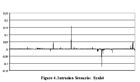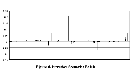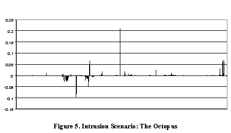 It was next of interest to examine the behavior of the kernel in response to a series of assault scenarios. In this investigation, we have explored several intrusion scenarios and their effect on the Linux kernel. Each activity running on the Linux kernel will cause the kernel to execute in a particular manner. By controlling for the effect of nominal system activity from any other activity we generate a signature profile for each one of them. In figures 4,5 and 6, we show the output of this differential comparison process for three intrusion scenarios we have investigated. The y-axis represents the impact of each intrusion activity on the nominal kernel activity. A positive value on the y-axis means that the system resources have decreased on the specific kernel module while the attack scenario was executing. Conversely, a negative value on the y-axis represents increased kernel module activity due to the intrusion. The first attack scenario is produced by the program synk4. Synk4 floods the system ports with different types of requests. The system can be halted by overloading and IP addresses can be spoofed by this application. The second intrusion scenario is produced by Octopus. Octopus is usually used to generate a denial of service attack opening many connections to a remote host. The host is overwhelmed by the number of request and halts. The last attack scenario is given by boink. Boink ex ploits the overlapping IP fragment bug present in most Linux kernels.What is astonishing and is clearly revealed on inspection of the intrusion scenarios we present is that the signatures of each of these activities are very different. These distinct scenarios have their own recognizable signatures that differ sharply from the nominal activity profile. We are currently developing signatures for the full gamut of known intrusions. This will permit us to recognize the full spectrum of known attacks involving the Linux kernel. It will also permit us to identify new and potentially invidious assaults that we have yet to witness. CONCLUDING REMARKS We have presented a novel methodology for intrusion detection in real time that uses dynamic measurement techniques to analyze the internal software behavior. After a series of experiments, which were presented in this paper, we have shown that internal behavior analysis has an enormous potential as an effective means to detect abnormal activities that might constitute threats to a system. Through the real time analysis of the internal program activities we can detect very subtle shifts in the behavior of a system. In addition, based on the initial experiments, we can presume that each attack has a particular internal behavior signature that can be recognized. At this experimental stage, we have not addressed many issues. A more complete procedure and formalism for the determination of the normal profile is necessary. We haven't established a mechanism to reduce and filter the "noise" generated by multiple users and applications, although the multiple stage detection might provide some answers to that. Last, we are currently starting to assess the performance and the detection rates provided by this methodology and there is still a lot of work ahead of us in this arena. In order to validate our methodology, we have created an environment to allow experimentation and characterization of different profiles. The environment will provide a means to facilitate the study and evaluation of the comparison strategies and provide the experimentation platform to run attacks on. That a system has functioned securely in its past is not a clear indication that it will function securely in the future. The continuing evaluation of profiles over the life of a system can provide substantial information as to the changing nature of the program's execution environment. This, in turn, will foster the notion that software security assessment is as dynamic as the operating environment of the program. Though we have specifically chosen to focus our energies on the investigation of intrusions against the Linux kernel, the methodology we have presented in this paper is not restricted to kernel type activities. The kernel was our first choice because it is a complicated real time embedded application. If the technology can be shown to work in this complex environment, it will easily port to applications outside of the kernel. Any software system is a potential candidate for this methodology.