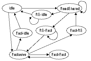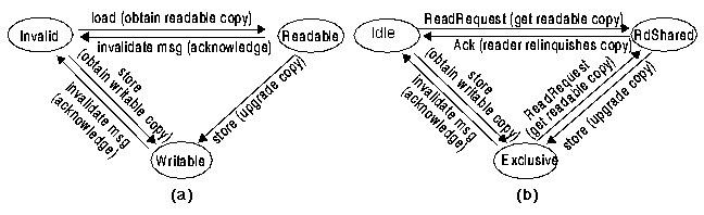 A common technique for ensuring coherence allows at most a single writer or multiple readers for any block of memory at a time. When the home receives a request for a writable copy of the block, it asks processors currently holding a readable copy to invalidate it, i.e. allow no further accesses. A writable copy can then be sent to the requestor. A cache coherence protocol specifies the actions taken by the home and caching processors in response to access faults and incoming messages. These actions are commonly captured by finite state machines, with transitions between protocol states occurring in response to faults and messages. Figure 1 shows sample state machines describing protocol actions for a caching processor and the corresponding home side. Both the home and caching processors associate a state with each memory block. At an access fault or upon a message arrival, the protocol engine consults the appropriate block's state to determine the correct action. Typical protocol actions involve sending messages and updating the state, access permissions, and contents of a memory block. Home nodes also maintain a directory, a per-block data structure that usually keeps track of which processors have a readable copy, or which processor has an exclusive copy. As an example, consider a (non-home) block that is initially in the Invalid state. A processor reading any address within the block causes an access fault, at which time the protocol is invoked. Its action is to send a request to the home node for a readable copy and await a response. Assuming no outstanding writable copy exists (the Idle state in Figure 1), the home responds with a readable copy and changes its state to ReadShared. The arrival of this message on the non-home side causes the protocol to copy the incoming data to memory and change the block's state to Readable (and access permissions are changed from invalid to readonly). Unfortunately, specifying protocols is much more difficult than the simple three-state diagrams in Figure 1 would lead one to believe. The main difficulty is that, although the transitions shown appear to be atomic, many state changes in response to protocol events cannot be performed atomically. Consider the transition from the Exclusive state to the ReadShared state in Figure 1. Conceptually, when a request arrives in the Exclusive state for a readable copy of a block, the protocol must retrieve the exclusive copy from the previous owner and pass it along to the requestor. The protocol sends an invalidation request to the current block holder, and must await a response before proceeding. But, to avoid deadlock, protocol actions must run to completion and terminate. This requires that an intermediate state, Excl-To-ReadShared, (Excl-RS for short) be introduced. After sending the invalidation request, the protocol moves to the Excl-RS state and relinquishes the processor. When the invalidation acknowledgment arrives in this intermediate state, the processor sends a response to the original requestor and completes the transition to ReadShared. A revised state diagram incorporating the required intermediate states is shown in Figure 2 (which is still far removed from a realistic protocol). Introducing intermediate states increases the number of states a programmer has to think about. Furthermore, while in an intermediate state, messages other than the expected reply can arrive. For example, before the invalidation response arrives in the Excl-RS state, another request for an exclusive copy could arrive from a different processor. A protocol designer must anticipate the arrival of such unsolicited messages and handle them in an appropriate manner. It may be tempting to not take such messages out of the network while they are not welcome: this, however, is not an option on most systems, because messages must constantly be drained from the network to avoid deadlock in the network fabric [27]. ![]()