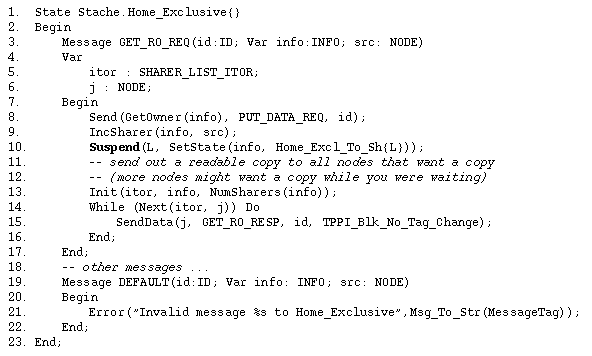 3.1 Language FeaturesA Teapot program consists of a set of states; each state specifies a set of message types and the actions to be taken on receipt of each message, should it arrive for a cache block in that state. We exhibit some of the features of Teapot using an example. The Teapot code in Figure 3 implements coherence actions for a block in the Exclusive state at the home node. Suppose the block receives the request message GET_RO_REQ, asking for a readable copy. The action code for this message first sends a PUT_DATA_REQ message to the current owner (note that the variable info is a pointer to the directory data structure). Next, it executes a Suspend statement. A Suspend statement is much like a "call-with-current-continuation" of functional programming languages. Syntactically, it takes a program label (L), and an intermediate state (Home_Excl_To_Sh) which it visits "in transition". The second label, {L}, specifies where execution should resume upon return, and can differ from the first argument. Operationally, Suspend saves the environment at the point it appears in a handler body and effectively puts the handler to sleep. This mechanism is used to provide a blocking primitive inside a handler, which physically needs to relinquish the processor every time it is invoked ![]()