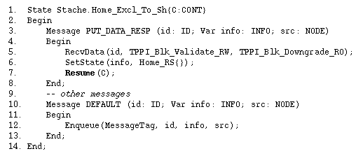 What happens in the intermediate state? Figure 4 shows the Teapot code executed when a PUT_DATA_RESP message arrives. The handler receives the up-to-date content of the cache block from the network, sets its own state to ReadShared, and executes a Resume statement. The Resume is the equivalent of a "throw" for a "call-with-current-continuation" of functional programming. Syntactically, it takes a continuation parameter (C) as an argument. (Note from line 1 in Figure 4 that the continuation variable C is a state parameter and is a part of the environment visible to all the message handlers in that state.) Operationally, it restarts a suspended handler immediately after the Suspend statement whose label is captured in C. Thus, after the Resume statement, GET_RO_RESP messages are sent to the set of requesters (see Figure 3 again, lines 13-16). Continuations in Teapot let us avoid having to manually decompose a handler into atomically executable pieces and sequencing them. Further advantages of the Suspend/Resume primitives are brought out in the case studies. Teapot provides a mechanism for handling unexpected messages