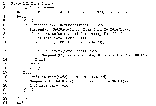 3.2 Verification SupportTeapot makes no attempt to verify protocols, but translates protocols into code for the Murphi automatic verification system[10]. Murphi explores all possible protocol actions by effectively simulating streams of shared-memory references, and ensuring that no system-wide invariants are violated. If unanticipated messages arrive or deadlock occurs, Teapot transforms the Murphi error log into a stylized diagram of the protocol events leading to the violation. Three basic components are required for verification: A Murphi description of the protocol under test, Murphi code implementing all types and subroutines used by the protocol, and a ruleset describing legal sequences of protocol events. While only the first component is generated by Teapot, examples of the remaining pieces are included with Teapot and can often be reused without modification. User intervention is required only if new types or routines are added, or the protocol being developed only handles stylized streams of protocol events. The latter scenario is described in more detail in the following section. 4 LCMThe Loosely Coherent Memory (LCM) coherence protocol [16] provides sequentially-consistent distributed shared memory as a default, and is similar in many respects to protocols like DASH [18], Alewife [1], and Stache[24]. The key difference is that LCM allows global memory to become temporarily inconsistent under program control. During such phases, a given data item may intentionally have different values on different processors. This makes management of shared data more difficult. Memory is returned to a globally-consistent state by merging distinct versions of each data item and ensuring that all processors see the new values. This requires coordination among all processors in the system, and mixes computation (merge functions) with traditional protocol actions. LCM implements the semantics of the data-parallel programming language C**[17] faster than conservative, compiler-implemented approaches. C** semantics specify that parallel function invocations on aggregate data do not interact. LCM enforces these semantics by keeping shared-data modifications private until all parallel invocations complete, then returns the system to a consistent state. Processes can still collaborate to produce values via a rich set of reduction operations (including user-specified reductions), but the results of these reductions are not available until after all parallel function invocations finish. 4.1 Initial ImplementationOur first LCM implementation effort was undertaken without the support of any formal methods or tools. The C-code source of the Stache (ordinary shared memory) protocol was available to us, so we used it as a starting point, adding extra LCM functionality as required. In retrospect, starting with Stache was an unfortunate decision. Stache, while a relatively simple protocol design, is still a large and complex piece of software. Adding LCM functionality required both that the behavior of existing protocol states be altered and that new states be added--a difficult proposition for the unaided programmer. Small changes in existing states (and the addition of a new states) often had far-reaching effects that were difficult to fully anticipate. It took several months for a single graduate student, working full-time, to complete the basic protocol modifications, after which a debugging phase began. It took roughly as long to debug the modified protocol as it did to write it in the first place, since the protocol was riddled with subtle timing-related bugs, the result of the unpredictable effects of our modifications. A suite of applications was used to debug the protocol--each application exercising a new set of path-specific bugs in LCM which had to be isolated, understood, and repaired. It often took days to identify infrequently-occurring bugs, and the resulting "fixes" many times introduced new bugs. Even after the LCM protocol had achieved relative stability, user confidence in its correctness was low. 4.2 Teapot and LCMAn early version of the Teapot system was ready for testing as debugging of the hand-written LCM protocol was being completed, and LCM was reimplemented with Teapot to more thoroughly evaluate the system. The Teapot environment was a vast improvement over the hand-coded approach. We found two language features of Teapot particularly useful: the "state-centric" programming model, and the use of continuations to allow blocking operations in handler code. Teapot enforces a protocol programming style that is easier to read and debug than that we used in C. Teapot code is organized by protocol states, each of which contains a list of handlers to be run for messages arriving in that state. This contrasts with the handwritten protocol's "message-centric" approach, where large handlers were written for each message type and selected different action code to run based on the protocol's state. Organizing the protocol by states makes it easier to express and implement for several reasons. First, each handler is now a smaller unit of code, since a self-contained handler is written for each combination of message and block state. Second, grouping handlers by state instead of message type keeps related information close together: A state's behavior can be understood by scanning a set of consecutive handlers, instead of looking through the entire protocol. Of course, in retrospect, we could have adopted a state-centric organization in the handwritten protocol, but the C language did not make the benefits of doing so immediately obvious while the Teapot system enforced a disciplined programming style that utilized the better design choice. Teapot's continuations also made an enormous improvement in handler legibility. Even for handlers using a single Suspend statement, keeping the code on either side of the call in the same handler dramatically increased readability. Some handlers used as many 