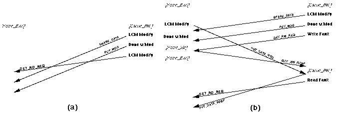 In Figure 6a, the caching processor performs an LCM modification of the block, creating a version that is inconsistent with respect to other copies in the system. However, since the cache side held the exclusive copy at the time it performed the modification, it first sends a copy of the block home. This data can be used by the home to respond to requests for the block from other processors. The block is returned home via a PUT_MOD message when the cache side is finished. The second LCM modification then faults and requests the block back from the home.[2] Messages have been reordered in the network such that the first to appear at the home is the request for data. The home detects the reordering, since it knows the requestor already has a copy of the block. The correct action in this case is to await the SHARE_DATA message, then satisfy the request. The home leaves the block in the Home_LCM state to denote the fact that at least one processor has created its own version of the block. Initially, we thought the arrival of the GET_RO_REQ in the Home_Excl state always implied the message reordering scenario in Figure 6a, and both the hand-written version of LCM and the first Teapot version encoded this assumption. Unfortunately, in the more complicated case shown in Figure 6b, this caused the protocol to respond incorrectly. The home should instead await the PUT_DATA_RESP message, transition to the Home_Idle state, and satisfy the request. Correcting the protocol is straightforward once the two scenarios have been identified, but it is unreasonable to expect an unaided programmer to have foreseen such a bug, due to the complexity of the cases involved. Enumerating all chains of protocol events and ensuring that they are properly handled is a job much better handled through verification. ![]()