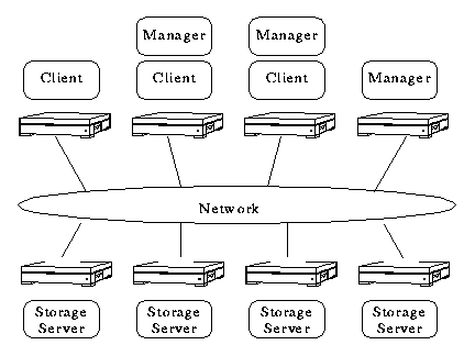 Each of the three subsystems implements a specific interface. A client accepts file system requests from users, sends data to storage servers on writes, forwards reads to managers on cache misses, and receives replies from storage servers or other clients. It also answers cooperative cache forwarding requests from the manager by sending data to other clients. The job of the metadata manager is tracking locations of file data blocks and forwarding requests from clients to the appropriate destinations. Its functionality is similar to the directory manager in traditional DSM systems. Finally, the storage servers collectively provide the illusion of a striped network disk. xFS employs a directory-based invalidate cache coherence