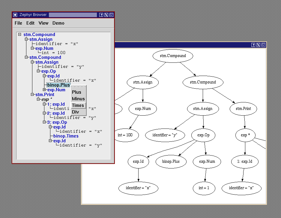 The browser is a graphical tool for viewing and editing arbitrary pickled ASDL values. The browser reads in two pickles to do this. One is an arbitrary pickled ASDL value. The other it the pickled ASDL description that contains all the ASDL types that occur in the first pickle. Given the ASDL description for the first pickle the brower-editor is able to display the first pickle as a hierarchical list or a graphical tree. It allows the user to specify how each kind of node is drawn by allowing the selection of colors, fonts, etc. Trees can be edited using standard cut and paste operations or by creating/modifying nodes. If the user double-clicks on a particular constructor, a pop-up menu will appear allowing the user to change which constructor-type the node should have. Upon selecting a type for a node, the browser fills in new nodes for the children of that type automatically. Pickles edited with the browser can be saved as a new pickled value.