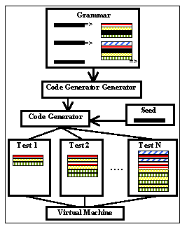 The rest of this paper describes our experience with lava aimed at achieving these goals. 3. Lava and Grammar-based Test Generation Figure 1. The structure of the test generation process. A code-generator-generator parses a production grammar, generates a code-generator, which in turn probabilistically generates test cases based on a seed. Our approach to test generation is to use an automated, well-structured process driven by a production grammar. A production grammar is the opposite of a regular parsing grammar in that it produces a program (i.e. all terminals, or tokens) starting from a high-level description (i.e. a set of non-terminals). The composition of the generated program reflects the restrictions placed on it by the production grammar. Figure 1 illustrates the high-level structure of the test generation process. A generic code-generator-generator parses a Java bytecode grammar written in lava and emits a specialized code-generator. The code-generator is a state machine that in turn takes a seed as input and applies the grammar to it. The seed consists of the high-level description that guides the production process. Running the code-generator on a seed produces test cases in Java bytecode that can then be used for testing. Grammar-Rule := name [limit] identifier "=>" identifier* [guard] [action] Identifier := Token | Variable Token := [a-zA-Z_][a-zA-Z0-9_]* Variable := "$" Token Guard := "guard{" code "}" Action := "action{" code "}" Figure 2. The grammar for the lava input language in EBNF form. Its simplicity makes the language easy to adopt, while variable substitution and arbitrary code sequences make it powerful. The input to the lava code-generator-generator consists of a conventional grammar description that resembles the LALR grammar specification used in yacc (Figure 2). This context-free grammar consists of productions with a left-hand side (LHS) containing a single non-terminal that is matched against the input. If a match is found, the right-hand side (RHS) of the production replaces the LHS. As with traditional parser systems, we use a two-phase approach in lava for increased efficiency and ease of implementation. The code-generator-generator converts the grammar specification into a set of action tables, and generates a code-generator that performs the actual code production based on a given seed. In essence, the code-generator-generator performs code specialization on a generic production system for a particular grammar. We picked this two-phase approach to increase the efficiency of the code-generator through program specialization. Within the code-generator, the main data structure is a newline-separated stream, initially set to correspond to the seed input. Being able to specify arbitrary seeds enables us to modify parts of existing programs in controlled ways. Each line in this stream is scanned, and occurrences of an LHS are replaced by the corresponding RHS. If there is more than one possible action for a given match, the code-generator picks an outcome probabilistically, based on weights that can be associated with each production. When all possible non-terminals are exhausted, the code-generator outputs the resulting stream. We then use the Jasmin bytecode assembler [Meyer & Downing 97] to go from the textual representation to the binary bytecode format. Lava grammars can be annotated with three properties that are useful for test generation. First, each production rule can have an associated name. Along with each test case, the code-generator creates a summary file listing the names of the grammar rules that gave rise to that test case, thereby simplifying test selection and analysis. We used these summary files extensively during JVM development to pick (or to skip) test cases that exhibit certain instruction sequences, as the high-level descriptions were easier to act on than reverse engineering and pattern-matching instruction sequences. In addition to a name, each grammar rule in lava may have an associated limit on how many times it can be exercised. Java, unlike most language systems, enforces certain structural limits, such as limits on code length per method, in addition to any limits the tester may impose to guide the test generation process. The limits on production rules enable the grammar to accommodate such constraints. Finally, in order to enable the production of context-sensitive outputs, lava allows an optional code fragment, called an action, to be associated with each production. This code is executed when the production is selected during code-generation, in a manner analogous to context-sensitive parsing using yacc grammars. An escape sequence facilitates the substitution of variables defined in actions on the RHS of productions. Actions are widely used in this manner to generate labels, compute branch targets, and perform assignment of values to unique local variables. The code in action blocks, like the entire lava system, is written in AWK [Aho et al. 88]. In addition to these attributes, each production carries a weight that determines which productions fire in case more than one are eligible for a given LHS. This case occurs frequently in code production, as it is quite often possible to insert just about any instruction sequence at any point within a program. The probabilistic selection based on weights, then, introduces non-determinism and enables each code-generator run to produce a different test case. The weights, specified as part of the seed input, determine the relative occurrences of the constructs that appear in the grammar. Separating the weights from the rest of the grammar enabled us to generate different instruction mixes without having to rewrite or rearrange the grammar specification. insts 5000 INSTS => INST INSTS emptyinst INSTS => /* empty */ ifeqstmt INST => iconst_0; INSTS; ifeq L$1; jmp L$2; L$1: INSTS; L$2: jsrstmt INST => jsr L$1; jmp L$2; L$1: astore $reg; INSTS; ret $reg; L$2: action{ ++reg; }Weight 
