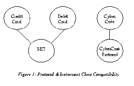 2.0 Terminology In this section, we briefly define some terminology necessary for understanding our wallet architecture. The wallet architecture is described in the next section. 2.1 Instrument Instance & Instrument Class An instrument instance (or, instrument, for simplicity) is a collection of state information representing economic value that a protocol can operate on as part of an electronic commerce transaction. For example, "Gary's Citibank Mastercard" is an instrument whose state is made up of his full name, credit card number, and expiration date. The instrument may also store other information such as his billing address. It is important to note that an instrument, in the context of this paper, is a digital proxy for an instrument in the "physical" world. "Gary's Citibank Mastercard" is, in reality, an agreement or contract between Gary and Citibank which may be made up of a signed credit card application in addition to other documents such as a contract stating Gary's credit limit and the terms of the agreement. The digital representation of this instrument, however, only contains state parameters that are relevant for conducting commerce transactions with that instrument, and the instrument's digital representation need not contain the actual contract. In the case of "Gary's Citibank Mastercard", for example, the digital instrument may only contain those state parameters necessary for the SET protocol [1] to execute an online payment operation. Each instrument belongs to an instrument class. An instrument class defines the structure of the state information necessary to store an instance of a given instrument, as well as behavior that is common to all instruments of that class. Examples of instrument classes are CyberCoin [2], ecash [3], or Mastercard. "Gary's Citibank Mastercard" is an instance of the Mastercard instrument class. 2.2 Protocol A protocol defines a sequence of steps that accomplish a particular operation using a specified instrument. In each step, the protocol may send information to a peer, or process information locally. For example, in one step the protocol may create a certificate containing the user's account number and payment amount. In the next step, it may send the certificate to the peer. The work of a protocol is to execute a correct sequence of steps to accomplish a requested operation; the sequence is not necessarily static and pre-determined, but may vary dynamically depending upon requests and responses sent between the parties executing the protocol. In general, a payment protocol is one that supports a PAY operation and whose sequence of steps results in a transfer of economic value between two or more parties. SET is a payment protocol that may be used to transfer monetary value from a bank to a vendor's account, while concurrently (and atomically) debiting the user's credit card account, under the condition that the resulting balance does not exceed the user's credit limit.A protocol may be defined to be compatible with one or more instrument classes. The SET protocol is compatible with both credit card and debit card instrument classes, and may be used to execute payment operations with both credit cards and debit cards (see Figure 1). The CyberCash Protocol, on the other hand, may only be compatible with the CyberCoin instrument class. ![]() Figure 1 Postscript