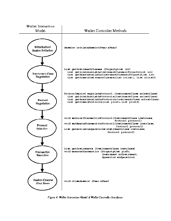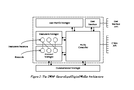2.3 Client A client is a human user or a software agent. A software agent may allow the user to make online purchases or participate in online auctions, for instance. 2.4 Digital Wallet A digital wallet is a software component that provides a client with instrument management and protocol management services. Instrument management and protocol management are defined in Section 3, but, in brief, are services that allow the wallet to 1) install and uninstall instrument classes and protocols, 2) create, update, and delete instruments and protocols, and 3) execute protocols. Digital wallets are capable of executing an operation using an instrument according to a protocol. A digital wallet presents its client with a standard interface of functions; in the case that the client is a human user, this standard interface of functions may be accessed through a graphical user interface (GUI). A digital wallet is linked into an end-user, bank, or vendor application and provides the application with instrument management and protocol management services. The digital wallets that are linked into vendor and bank applications provide these management services in the same way that end-user digital wallets do. A vendor's digital wallet, however, may be part of a much larger software application that is integrated with order and fulfillment systems. Similarly, a bank's digital wallet may be part of a larger application that is integrated with general ledger, profit & loss, and reconciliation systems. Furthermore, a wallet is not limited to being a plug-in or applet or some other extension of a web browser. A digital wallet with a graphical user interface may also run as an application on its own. A digital wallet may also run on computers that are not connected to the Internet such as smart cards or personal digital assistants. The user interface to the digital wallet may vary in such cases. In the case of a PDA, for example, the digital wallet may have a pen-based user interface. In the case of a smart card, the digital wallet may have no user interface at all. Nevertheless, in each case, the set of functions that the digital wallet's interface presents to its client should be the same. 2.5 Peer A peer is a remote entity that may be an end-user, vendor, or bank wallet that is capable of performing operations on instruments according to a protocol. 2.6 Session