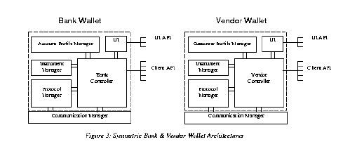 4.0 Vendor and Bank Digital Wallets The end-user wallet interacts with bank and vendor wallets to execute commerce transactions. The bank and vendor wallets have architectures symmetric to the user's digital wallet, as shown in Figure 3. ![]() Figure 3 Postscript In place of a User Profile Manager, the bank wallet has an Account Profile Manager that allows the bank to manage non-financial information about the bank's clients. (Financial information about the bank's clients is stored in instruments in the bank's Instrument Manager.) Similar to the way in which the User Profile Manager maintains access control information about instrument instances, the Account Profile Manager does the same for the bank wallet. The Bank Controller queries the Account Profile Manager before accessing instrument instance data to determine whether or not the user has the appropriate authorization to conduct a transaction; in the case that a user’s credit line has been overdrawn, or if the user’s credit card has been cancelled, the Account Profile Manager would return an error response to the Bank Controller’s query. In the vendor wallet, the User Profile Manger is replaced with a Customer Profile Manager, which is used to store access control information about its customers in the case of non-anonymous transactions. For example, the Customer Profile Manager might store the user’s age, and the Vendor Controller may query the Customer Profile Manager to determine if the user is above a certain age to purchase a product. A key difference between the Wallet Controller running in the end-user application and the Bank and Vendor Controllers running in the bank and vendor applications, respectively, is that the end-user Wallet Controller drives the wallet interaction, and it is active, in that it generates requests and receives responses. The Bank and Vendor Controllers, on the other hand, are passive, in that they receive requests and generate responses. A Wallet Controller generates requests, and these requests are pushed down through its Communication Manager and out to the peer wallet. Peer wallets receive requests through their Communication Managers, and the requests are propagated to and are serviced by the Bank and Vendor Controllers. The Instrument, Protocol, and Communication Managers used by the end-user, bank, and vendor are one and the same, and are re-used across the wallets.