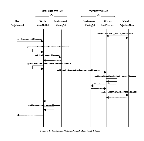 5.0 Wallet Operation & Interaction Model In this section, we describe how our symmetric, client-driven wallets operate and interact during a session to execute a payment. (Executing any other operation such as a refund happens in a similar fashion, and may possibly require only a subset of the steps described below.) In our example here, we assume that the "ordering" phase of the shopping interaction is complete, and the necessary "invoice" (containing information about what products and/or services the end-user would like to purchase) is stored in a property list called inv as a set of (name, value) pairs. We will describe the process from the point of view of the end-user wallet, and we will use the diagram in Figure 4 as an aid. To the right of the states in Figure 4, we supplement the figure with the method names from our wallet implementation that an application would invoke on the Wallet Controller. Methods in boldface are public in the Wallet Controller's interface, while methods in regular font are private to the Wallet Controller. Finally, the careful reader will note that the methods seem single-threaded; it is because the wallets in our implementation are single-threaded. However, we can easily extend to the multi-threaded case by passing the Session object to each method (excluding initiate-Session()), or by instantiating one Wallet Controller per session.Although we describe the interaction from the end-user wallet point of view, it is important to keep in mind that a vendor or bank's wallet can also be a client in a wallet interaction. For example, as part of a transaction with the end-user wallet, a vendor's wallet may act as a client and initiate a session with a bank's wallet to obtain credit authorization information for a purchase. 5.1 Initialization / Session Initiation. When an application is launched, static initialization takes place before it starts executing. During static initialization, the wallet components including the Instrument Manager, Protocol Manager, and Profile Manager are constructed and initialized. After static initialization, the wallet may be "unlocked" by supplying login/password information and a session with a peer wallet may be initiated. The Wallet Controller presents the user's login and password to the User Profile Manager to determine if the user should be allowed to use the wallet. The Wallet Controller also passes the user's password to the Instrument Manager so that it may use the password to decrypt instrument instances and/or the user's private key from persistent store. To initiate a session, the initiate-Session method in the Wallet Controller is called, passing a Peer object as a parameter. (A Peer object contains the peer's name and details about how to set up a session with that peer.) The Wallet Controller's initiate-Session, in turn, calls the Protocol Manager's initiate-Session to initiate the session. The Protocol Manager makes calls to the Communication Manager to set up the session with the remote peer using the underlying communication mechanism.5.2 Instrument Class Negotiation The first step that takes place after session initiation is instrument class negotiation. In this step, the client’s wallet can determine what instrument classes are known to both wallets by 1) determining what instrument classes are known to its Instrument Manager, 2) determining what instruments are known to the remote Instrument Manager, and 3) computing the intersection. Those instrument classes that are available to both wallets may offer different terms and conditions for purchasing a given set of products or services. As an example, the price of a product may vary depending upon whether the customer decides to pay using a credit card or using ecash. Furthermore, extended warranties may be offered in the case that a credit card is used to make a purchase. For each available instrument class, the instrument class negotiation step also determines these terms and conditions. To start instrument class negotiation, the application calls the Wallet Controller's get-Instrument-Classes method with the invoice information, inv, as an argument. (The invoice information is included to determine the available instrument classes because some instrument classes may not be applicable for certain types of purchases. Also, the inv property list is populated with the terms and conditions described above such that the terms and conditions become part of the invoice.) The Wallet Controller then calls its get-Local-Available-Instrument-Classes method to determine what instrument classes the local wallet supports and are available. The Wallet Controller makes this determination by, in turn, making a call to the Instrument Manager to determine what instrument classes are available to the wallet. Then, the Wallet Controller calls its get-Remote-Available-Instrument-Classes method to determine what instrument classes the remote peer is capable of dealing with.The call to get-Remote-Available-Instrument-Classes results in a remote procedure call to the peer's Wallet Controller. To respond to the get-Remote-Available-Instrument-Classes procedure call, the remote Wallet Controller calls its get-Local-Available-Instrument-Classes. Other calls of the form get-Local... and get-Remote... described in the following sections work similarly. Also, in our implementation, the get-Remote-Available-Instruments call populates a "price" property stored in inv with a list of (instrument class, price) pairs to indicate the different prices that would be charged for using the corresponding instrument classes in addition to reporting the available instrument classes. The call chain for instrument class negotiation is depicted in Figure 5. Solid arrows in Figure 5 indicate method calls from the object from which the arrow originates, and dotted arrows indicates the return of control. (The Wallet Controller relies on the Communication Manager to handle the low-level details of executing