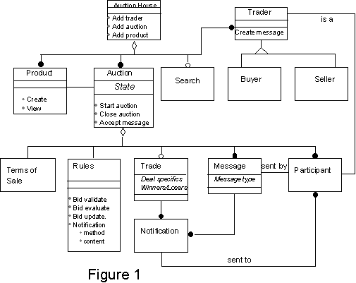 In Figure 1 multiple products, traders, and auctions are part of the auction house. Each auction is for one or multiple copies of a single product and a subset of traders participate in it. The product object describes the product or service being auctioned. It is separate from the auction object because the same product can be auctioned in different quantities in different auctions held at different times. For example, a seller with 500 widgets may wish to sell 100 widgets on each day of a chosen week. The search object supports various search methods on the products in the store. Its attributes will be the different classifications of products required by the search methods. In addition to products and participants, the auction object comprises messages created by participants, terms of the final sale, rules of the auction, and the final trade generated at the end of the auction. The important message types in an auction are query, create, update, and delete bid messages send by the buyers; and messages sent by the seller to close the auction manually or change the asking price in a Dutch auction. The state attribute of auction restricts the type of messages a participant can create when the auction is in that state. For example a simple open cry auction can be in one of three states, active, closed, or not-started. Changing rules and parameters of the auction, like adding or changing the reserve price or minimum starting bid, would be allowed only by the seller while the auction is in the not-started state. Similarly, buyers may be allowed to submit bids while the auction is in not-started or active state, but they may be allowed withdraw bids only when the auction is in not-started state. The accept-message method of auction object queries the auction rules external to the auction object to determine if a message can be accepted. Each message, for example, bid from a buyer or closing of auction by the seller, results in updates or notifications being sent to all or some of the other participants. Different participants may get different notifications. For example, when a bid is submitted in an open-cry auction the bid submitter gets a simple acknowledgment, the bidders whose bids are lower than the newly submitted bid will be informed that a higher bid has been submitted, while bidders whose bids are already higher than the newly submitted bid may get no notification at all. Similarly, when the auction closes, the winners and losers will get different notifications. The notification object encapsulates multiple transport methods to send the notifications to the participants. E-mail, online notification via a push or pull mechanism, and manual polling by the bidder are possible. The rules object provides the method to determine which notification methods must be used with each message. The rule object contains methods which modify the behavior of other objects. Two examples cited earlier are rules governing when a certain type of message is accepted by the auction object and the rule governing the method used to notify participants. Rules which need to be set or fine-tuned by the auctioneer or seller are specified in the rule object and methods are provided to review and set these rules. The trader object basically contains the registration information for the buyers and sellers. In addition to name, address etc., it may contain buyer preferences for products, preferred method for being notified of auction updates, and passwords. It also contains a list of auctions on the auction site that a bidder has participated in or has expressed an explicit interest in. We refer to this short list as the bidder’s personal auction gallery. The auction object and the rules object would be subclassed to support different kinds of auctions. For example, the Dutch auction object derived from the basic auction object would provide a method to accept a message from the seller which revises the asking price downwards. Similarly the bid objects can be subclasssed. All bids would share common sending, receiving, and archiving methods, but the Dutch auction bids would not allow a non null value for price (the Dutch auction bid contains amount, the price being quoted by the auctioneer/seller).