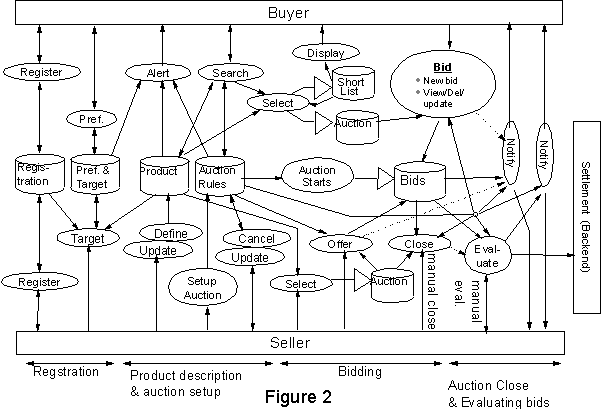 Process flow model: In the process flow diagram in Figure 2, the three rectangles (buyers, sellers, and settlement system) are the active producers or consumers of information at the boundary of the data flow graph. The disk symbols are information repositories internal to the data flow model. Ovals represent processes, solid arrows represent flow of information, and dashed arrows represent control signals. A hollow triangle at the end of a line indicates a repository created by a process, some of which can be temporary. The five steps of the auction process mentioned in the previous sections are identified in the data flow model at the bottom of Figure 2. As shown in Figure 2, buyers and sellers can register themselves to create trader objects. Additionally, buyers register their preferences through the preference process and sellers can use this information to create target lists to promote to promote a product or class of product to buyers in a target list. The sellers use the define/update process to create a description of the product being auctioned and use the Setup auction process to describe the type of auction and various rules that go along with it. If the auction rules permit they can cancel the auction or update some of its parameters such as closing time. The alert process notifies a buyer when a product is placed on auction that matches his preference, or if the auction rules or product information changes for such products. The search process provides various search metaphors to help the buyer find/select an auction. The selected auction can either be entered in a list of interesting auctions or the buyer can proceed to bid on it. In the latter case notifications may be sent to bidders whose bids are superseded. The seller can also select an auction, and in case of