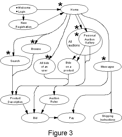 Navigation Figure 3 shows how the bidders navigate the auction web site. Each bubble shows a web page and arcs from one page to another indicate that a hot link is available from the first page to the second. The seven pages marked with asterisk can be accessed any time from the side bar. The auction site URL puts a bidder on the Welcome page from where a registered user can authenticate himself to the web site and initiate a secure session (login). An unregistered user will get the opportunity to fill in a registration form which may be processed online or off-line. After registering, the bidders can browse through or search the products in the auction house which will possibly result in a product being selected and its description presented to the bidder. If the product is on auction, the rules of auction can be viewed, and bids can be submitted for that product.