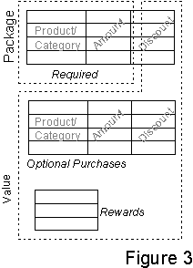 Retailer fraud: The most obvious form of retailer fraud is for retailers to collect a large number of coupons from a web site that is publishing the coupons. Of course, the retailers would have to obtain those coupons through a phony set of names and addresses. Then these coupons can be redeemed by the retailer to either reward his customers or he can somehow redeem these captured coupons and pocket the proceeds. This type of fraud can be controlled by ensuring that obtaining large number of phony identities is difficult. A practical way to handle this situation currently is to require that coupons be published at sites that require users to register before they get access to the site. News media and magazines and Internet service providers (ISP) will meet this criterion. When a buyer clicks on a coupon to capture it, the publishing site will provide the registration information about the user such as his name, address and telephone number to the coupon server. This information will be encoded in the issued coupon, as is done to prevent coupon trading. Now to capture a large number of coupons from the coupon site the retailer will have to keep either multiple subscriptions to newspapers/magazines or maintain multiple accounts with an ISP, both of which are economically unattractive. News media and ISPs would probably be willing to provide this service because it makes couponing on the Internet practical and provides coupon publishing revenue to them. A second kind of retailer fraud is possible where a retailer makes multiple copies of a coupon he receives from some shopper. Even if retailers are required to maintain a record of the coupons redeemed at their store and prevent duplicate redemption, they can exchange lists of coupons with other retailers. In both cases the retailers will blame the duplication on shoppers. We are looking into off-line digital cash mechanisms and other approaches for solutions to this problem. 5. Structure of E-Coupons An electronic coupon will contain the description of the product/package to which the coupon applies, its value, restriction on its use, and several other fields which are described next. The description of the product or package: Figure 3 illustrates the implementation of product/package and coupon value. Package is essentially a list of references to products (particular brand name or model number), or product categories (all Sony TVs, all 25" TVs, or all electronic appliances). For each item in the list, an amount is specified. Amount can be count, weight, or value of purchase. Package specifies the list of products and their quantities that a shopper is required to have in order for the coupon to be applicable. Thus, a package can specify multiple items of a kind, like 5 shirts, or bundle of different products like combination of shirts and ties. Information referenced through the product field in the package might include a text description of the product, a UPC bar code for the product or package, or a store’s SKU number (for store coupons). Coupon value: