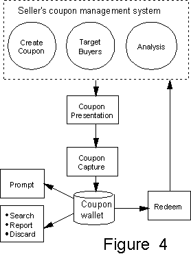 The coupons in the coupon wallet have a link to product's description. Coupons redeemed by the shopper are retained in this file for a certain period specified by the store, but are checked off to prevent repeat redemption. This allows the store to analyze shoppers’ coupon redemption behavior. The different steps of the electronic coupon application are described next. Seller’s coupon management system: