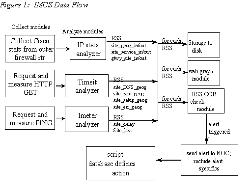 not apply 4.1.4. Data Flow between Modules Earlier, we talked about how Imeter, Timeit, and IP Stats generated data with separate data collection modules. We also mentioned how data was fed into the OOB checker to determine out of bounds conditions. How does all the data flow between IMCS modules. We show the data flow and key metrics in Figure 1. The raw data generated from the collection modules are transferred to analyzer modules, which compute data values RSS. The RSS data values are stored to disk, sent to the graphing module for display, and piped into the OOB checker for alerting. If an out of bounds condition is detected, then an alert is sent to the Intel Network Operations Center (NOC). 4.2. Monitoring IMCS Metrics and Responding to IMCS Alerts Figure 1 shows that when an out of bounds condition is detected, an alert is sent to Intel’s NOC. What happens when that alert is sent? How does the NOC know what to do? This section describes how we implemented the user interface to IMCS and how alerts are processed. Once IMCS generates an alert, an alphanumeric page is sent to the Intel Network Operations Center describing the RSS that is out of bounds. If you look at figure 1, you will notice that each RSS metric contains the site name and the type of metric (loss, delay, HTTP rate, etc.). NOC personnel execute a script based on the type of metric. For example, if a delay alert is generated, there is a specific script that must be done that is different from say, an HTTP rate alert. The site information lets the NOC know where the problem lies and who to dispatch to fix the problem. The main interface to IMCS is a web page that we call "The Big Picture." The Big Picture is a snapshot of all of Intel’s Internet connectivity in one screen. This web page is a large table where each row is a different type of metric (e.g. packet delay) and each column represent a firewall complex. In each cell of the table is a thumbnail graph of the appropriate metric for each firewall are shown. The thumbnail shows a rolling 24 hour graph for that metric. This allows someone looking at the big picture page to see a comparative view of the metric from each firewall. At the start of on each row of the Big Picture is a script that describes how to handle alerts for the metric. Across the top of each column is general information about that particular firewall complex. There is a web link to the history of alerts for each gateway, as well to as IMCS System Status for each gateway. If a gateway IMCS system is having a problem then its System Status turns red. Otherwise it is green. Each miniature "thumbnail" graph on the Big Picture is linked to a web page containing more information about that gateway's metric. This makes it easy to quickly drill down and get more information about a problem or look in detail at a metric. On these more detailed pages, we display graphs of rolling 24 hours, the current week, the last week, and the past 20 weeks for that particular metric. We can also get the actual data points for recent values of the metric. This is useful when you need real data values for troubleshooting a problem or for tuning the alert threshold values. IMCS scripts usually have the NOC personnel check if an out of bounds condition is local or Internet wide and change their response accordingly. On each metric row, there is a pointer to the proper script that is to be executed when an alert for that metric is received. The modular construction of IMCS and its geographically distributed monitoring systems lends itself well to using the web as the primary reporting and access mechanism. In order to remain somewhat browser and HTTP server independent, all of the IMCS display and query functions are built on standard HTML pages, with frames and JavaScript used sparingly to provide easy control, and common CGI Perl programs to remotely generate HTML pages based on GET-mode queries. Debug programs such as ping, traceroute, and whois are implemented as CGI programs. The use of GET-mode CGI queries allows you to copy an URL to a mail message, send it, and have someone else see the results of the query too. It also enables us to embed actual pings or traceroutes into a script HTML page. We can have a link such as "ping the gateway interface" point to a URL that actually pings the gateway interface and return the results. While each IMCS system creates HTML pages and graphs/thumbnails for each metric on its own document tree, a special setup was required to produce the "Big Picture" that would accommodate the potential outages of a remote IMCS system, and display the overall health of the firewalls. The page containing the Big Picture is not on several servers – only one. We discovered that browsers don't always flush graphics from the browser cache (even with a Pragma: no-cache, and all the other standard tricks), unless the web-server also emits an Expires: header for the graphic. Our previous web servers did not have an Expires option so we use the Apache server, which does have the Expires option. A cron job was constructed to run every three minutes to grab the latest thumbnails for a Big Picture display. This job refreshes the graphics for display and reports possible problems with the measurement process. 4.3. Other implementation highlights IMCS is implemented with PERL, C, and Expect. The analyzers, OOB checker, pager, and graph generator are done in PERL. The PERL graphing code makes use of GNUplot and pbmtools to generate GIF files. Packet delay and loss data are collected by fping, a C program. Router statistics are collected by an Expect script. Individual modules are configured with text files on the file system of the IMCS monitor. Only one configuration file exists for a particular module – it is edited and stored in one central location and pushed to IMCS machines through our Make driven update process [8]. Processes on each machine go through a rule set to see which configurations and di