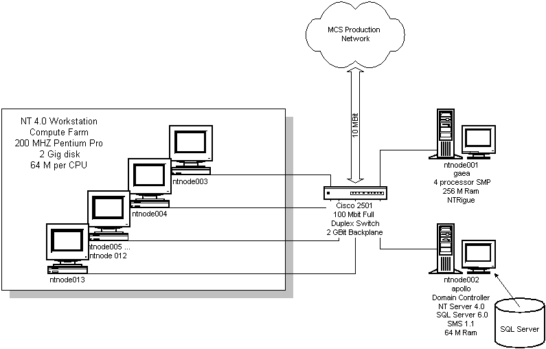 We started out building a small prototype system in order to test the concept. This is an exploration; it's not an attempt to actually turn these machines into a user facility that is supported the same way our supercomputer is. If this project is a success, that will eventually be the goal, but we're not there yet. We've started with a modest set of machines - 11 Pentium Pro machines, with varying numbers of CPUs. They are connected over a 100baseT Ethernet switch. We will soon be expanding the pile to add substantially more nodes. We plan to grow to around a hundred machines in the near future, so that we will be able to test scalability issues. The current configuration is detailed in Figure 1. The machines are operated as their own NT domain, which trusts the primary NT domain of our division. Most of the nodes are compute nodes, running Windows NT Workstation 4.0; another node is the nominal front-end (see below), which is running NTRIGUE [3]. Requirements and Solutions Traditional supercomputers are built around a model that consists of the following pieces: