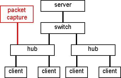 Figure 1: Switch-based benchmark configuration with packet capture machine on client hub