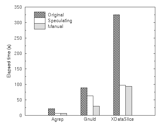 As shown in Figure 3, performing speculative execution significantly reduces the execution times of our benchmark applications (by 69%, 29% and 70%, respectively, for Agrep, Gnuld and XDataSlice). For Agrep and XDataSlice, we were able to automatically achieve the same performance improvements obtained when the applications were manually modified to issue hints. For Gnuld, our gain was much less than that of the manually modified application, but still represents a substantial improvement over the original non-hinting application. Based on these results, and considering the relative unsophistication of our tool, speculative execution promises to be an effective technique for exploiting disk parallelism and underutilized processor cycles to reduce the execution time of disk-bound applications.