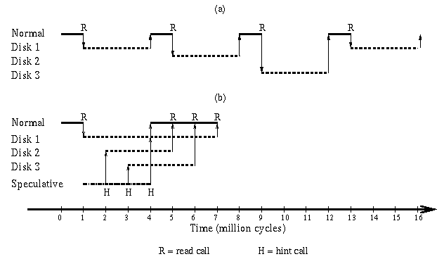 Figure 1 depicts the intuition as to why speculative execution works. Consider an application which issues four read requests for uncached data and processes for a million cycles before each of these read requests. Assume that the data is distributed over three disks, that the disk access latency is three million cycles, and that there are sufficient cache resources to store all of the data used by this application once fetched. If we assume that speculative execution proceeds at the same pace as normal execution, then, while normal execution is stalled waiting for the first read request to complete, speculative execution may be able to issue hints for the remaining three read requests. If the data layout allows the hinted data to be fetched in parallel with service of the outstanding read request and the subsequent processing, then all of the subsequent read requests will hit in the cache, and the application's execution time will be more than halved.