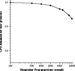 Figure 7 shows the same experiment run with competing load. For simplicity, the load corresponded to a miscellaneous job (no progress-metric) that tries to consume as much CPU as it can. The effect of the competing load is that the total desired allocation of the producer, consumer, and load threads is greater than the amount available, and hence the controller must squish allocations. The top two graph shows the resulting allocations to these three jobs (separated for clarity). The producer's allocation is fixed because it has specified a reservation. The load's allocation is initially high, but effectively loses allocation to the consumer since its pressure Qt is constant over time while the consumer's grows as it falls further behind the producer. If it were the case that there was not sufficient CPU to satisfy all the jobs, the queue would eventually become full and trigger a quality exception, allowing the application to adapt by lowering its resource requirements. One interesting result is the high frequency oscillation in allocation between the load and the consumer. This oscillation results from changes in the relative pressures from the hog and the consumer. When the consumer matches the fixed rate of the producer, its Qt is low while the hog's Qt remains constant. As it falls behind, its Qt grows until it exceeds that of the hog, and it gets more allocation. This behavior matches our expectation for real-rate jobs which must track some real-world rate, such as the rate of requests arriving at a web server. We believe that in the future most jobs will have progress metrics, and the use of a constant pressure, and hence the occurrence of such oscillation, will be infrequent. Improving the Controller's BehaviorWe have several ideas for increasing the accuracy of the allocation. First, we plan to lower the overhead of the controller in order to run it at a higher frequency. Calculating the exponential and linear curves more frequently causes the allocation to change faster, and results in a more responsive system without affecting its stability. In some sense a priority-based scheme is perfectly responsive, but is also inherently unstable. Second, our controller currently suffers quantization errors because the minimum allocation is 1 msec. We are currently exploring possible solutions to this. One possibility is a more efficient dispatch algorithm that can be run at a higher rate. Another possibility is to provide better accounting, e.g., microsecond granularity, while keeping the dispatch interval at 1 msec. This reduces our ability to guarantee proportion since we cannot prevent a job from running for its full time-slice. However, our controller could preempt earlier if the thread makes a system call or an interrupt occurs. In addition, our use of feedback could account for instantaneous discrepancies by smoothing allocation over time. To determine the overhead of smaller dispatch quanta, we measured the overhead of running Linux with various time-slice lengths. We measured the amount of CPU available to applications by running a program that attempts to use as much CPU as it can. Figure 8 shows the results of this experiment. The number plotted is the amount of CPU the program was able to grab, normalized to the amount it can grab on a kernel with a time-slice of 10msec. The graph shows the results of the higher overhead for smaller quanta, with a knee around 4000 Hz (250 msec). We conjecture that we could run with a dispatch interval in the range of 50 msec on faster CPUs with a small effort to optimize our code. ![]()