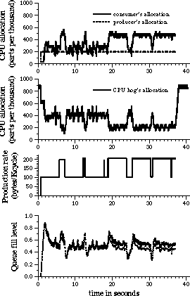 Benefits of Real-Rate SchedulingThe benefit of scheduling based on progress is that allocation is automatically scaled as the application's requirements change. In our system, the amount of CPU given to a thread grows in relation to its progress pressure and importance. For example, we have a multimedia pipeline of processes that communicate with a shared queue. Our controller automatically identifies that one stage of the pipeline has vastly different CPU requirements than the others (the video decoder), even though all the processes have the same priority. This results in a more predictable system since its correctness does not rely on applications to be well-behaved. In other words, when a real time job spins instead of blocking, the system will not livelock. Another benefit is that starvation, and thus priority inversion, cannot occur. Dependent processes (connected (in)directly by progess metrics) cannot starve each other since eventually one will block when its fill-level reaches full or empty. Further, dependent processes can dynamically achieve stable configurations of CPU sharing that fair-share, weighted fair-share, or priorities cannot. For independent non real-rate threads, we prevent starvation through our fair-share or weighted fair-share policies. In particular, one process cannot keep the CPU from another process indefinitely simply because it is more important. A third benefit of our approach is that it automatically provides both "best-effort" and "real-time" scheduling, in addition to the real-rate scheduling that motivates the work. However, we believe the real-rate category to be the most important of the three in the future, as people use computers to interact with each other and with the real world. Effect on Miscellaneous ApplicationsAlthough the importance of real-rate applications such as speech recognition, multimedia, and Web servers will grow to dominance in the future, many PCs still run a mix of more traditional applications that have no rate requirements and for which priorities have sufficed. For these applications, our approach can potentially reduce performance (modulo responsiveness). However, these applications can still suffer from priority inversion and starvation, even if they do not benefit from predictable scheduling and fine-grain control. We suggest the right solution for these applications is to add a pseudo-progress metric which maps their notion of progress into our queue-based meta-interface. For example, a pure computation (finding digits of p or cracking passwords) could use a metric such as the number of keys it has attempted. This could be done transparently by augmenting the in-kernel resources such as ttys or sockets to expose fill-levels to the scheduler. Although we might be able to improve the performance of our scheduler for miscellaneous jobs, we believe jobs with no time or rate requirements will be uncommon in the future and thus such an effort is likely to have small returns relative to those gained by converting the jobs to be real-rate. Related WorkThere exists a large body of work which has attempted to provide real-time scheduling support in operating systems, Jones et al. [11] provide a nice summary. Linux, Solaris, and NT provide "real-time" priorities, which are fixed priorities that are higher in priority than regular priorities. More relevant to this work are efforts to schedule based on proportion and/or period [11, 15, 20, 21]. To date, all such approaches require human experts to supply accurate specifications of proportion and/or period, and focus on how to satisfy these specifications in the best way. None of them try to infer the correct proportion, or adapt dynamically to changing resource needs of the applications. In addition, several systems use hybrid approaches to merge the benefits of reservation and priority scheduling. Typically these approaches use a heuristic that gives a static [4, 8] or biased [7] partition of the CPU to either real-time jobs or non-real-time jobs. A new approach is taken by the BERT and SMaRT schedulers, which dynamically balances between the needs of both kinds of jobs. The SMaRT scheduler lets users assign priority to either conventional or real-time threads, but gives weight to non-real-time threads within the same equivalence class [15] . Although we implicitly give precedence to real-time tasks (those that specify both proportion and period), we expect most jobs to fall into the real-rate category. This includes all of what most people consider "soft-real-time" applications such as multimedia. The BERT scheduler handles both real-time and non-real-time tasks using the same scheduling mechanism. Jobs submit units of work to be scheduled, and the scheduler creates deadlines for the work based on previous measures of the work's time to completion. BERT automatically assesses whether a given job will meet its deadline, and if not can either steal cycles from a lower priority job or can cancel the job [1] . BERT is similar in philosophy to our approach since it uses feedback of past execution times in its scheduling, but it does not use or measure application progress and as such is subject to the same problems as traditional schedulers. Our solution is similar to Rate-based scheduling proposed by Jeffay and Bennett [10] , in that resources are allocated based on rate specifications of x units of execution every y time units. However, their units are events which are converted to CPU cycles using a worst-case estimate of event processing time. Applications must specify x, y, and the worst-case estimation, and an upper-bound on response time. In addition, these values are constant for the duration of the application Their system also uses pipelines of processes so that dependent stages do not need to specify their rate, merely their event processing time. In contrast, our system provides dynamic estimation and adjustment of rate parameters, and only requires that the process metric 