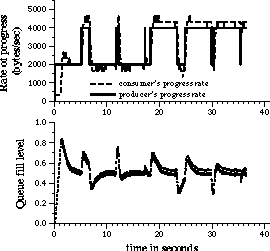 The Reservation SchedulerOur scheduler is a standard "reservation-based" scheduler that allocates CPU to threads based on two attributes: proportion and period. The proportion is a percentage, specified in parts-per-thousand, of the duration of the period during which the application should get the CPU, and the period is the time interval, specified in milliseconds, over which the allocation must be given. For example, if one thread has been given a proportion of 50 out of 1000 (5%) and a period of 30 milliseconds, it should be able to run up to 1.5 milliseconds every 30 milliseconds. Intuitively, the period defines a repeating deadline. To meet the deadline, the application must perform some amount of work. Hence, to satisfy the application the scheduler must allocate sufficient CPU cycles, which in our case is the proportion times the period times the CPU's clock rate. If the scheduler cannot allocate the appropriate amount of time to the thread, the thread is said to have missed a deadline. An advantage of reservation-based scheduling (footnote 1) (RBS) is that one can easily detect overload by summing the proportions: a sum greater than or equal to one indicates the CPU is oversubscribed. If the scheduler is conservative, it can reserve some capacity by setting the overload threshold to less than 1. For example, one might wish to reserve capacity to cover the overhead of scheduling and interrupt handling. Upon reaching overload, the scheduler has several choices. First, it can perform admission control by rejecting or cancelling jobs so that the resulting load is less than 1. Second, it can raise quality exceptions to notify the jobs of the overload and renegotiate the proportions so that they sum to no more than the cutoff threshold. Third, it can automatically scale back the allocation to jobs using some policy such as fair share or weighted fair share. In our system, these mechanisms are implemented by the controller, and are discussed below. We have implemented a RBS scheduler in the Linux 2.0.35 kernel by adding a new scheduling policy that implements rate-monotonic scheduling (RMS) [14] using Linux's basic scheduling mechanisms [2] . Linux implements a variant of the classic multi-level feedback scheduling that uses one run-queue, and selects the thread to run next based on a thread property called goodness. At dispatch, i.e. when deciding which thread to run next, Linux selects the thread with the highest goodness on the run queue. If all threads on the run-queue have a zero goodness value, Linux recalculates goodness for all threads in the system. Each thread has a scheduling policy that is used by Linux for calculating goodness. Our policy calculates goodness to ensure that threads it controls have higher goodness than jobs under other policies, and that jobs with shorter periods have higher goodness values. When a thread has used its allocation for its period, it is put to sleep until its next period begins. Because enforcement of our RBS scheduling policy can only be made at dispatch time, we call this low-level scheduler the dispatcher, and the time between dispatches the dispatch interval. The interval is bounded above by the timer interval, which we have set to be 1 millisecond for our prototype. The key features of this prototype RBS are very low overhead to change proportion and period, and fine-grain control over proportion and period values. We could equally well have used other RBS mechanisms such as SMaRT [15], Rialto [11] , or BERT [1] had one been available on our platform. Monitoring ProgressThe novelty of our approach lies in the estimation of progress as the means of controlling the CPU allocation. Unfortunately, estimating an application's progress is tricky, especially given the opaque interface between the application and the operating system. Good engineering practice tells us that the operating system and application implementations should be kept separate in order that the operating system be general and the application be portable. Our solution to this problem is based on the notion of symbiotic interfaces, which link application semantics to system metrics such as progress. For example, consider two applications with a producer/consumer relationship using a shared queue to communicate. A symbiotic interface that implements this queue creates a linkage to the kernel by exposing the buffer's fill-level, size, and the role of each thread (producer or consumer) to the system. With this information, the kernel can estimate the progress of the producer and consumer by monitoring the queue fill level. As the queue becomes full (the fill-level approaches the maximum amount of buffering in the queue), the kernel can infer that the consumer is running behind and needs more CPU and that the producer is running ahead and needs less CPU. Similarly, when the queue becomes empty the kernel can infer the producer needs more CPU and the consumer less. This analysis can be extended to deal with pipelines of threads by pair-wise comparison. Over time, the feedback controller will reach equilibrium in steady-state provided the design is stable. Our solution is to define suitable symbiotic interfaces for each interesting class of application, listed below. Given an interface, we can build a monitor that periodically samples the progress of the application, and feeds that information to the controller.