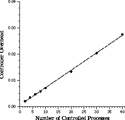 Overhead that is linear with the number of threads under control is a necessary evil for feedback-controlled systems. The benefit is that the system dynamically and rapidly detects changes in the threads' resource requirements, which results in very efficient resource utilization. Fortunately, this recalculation need only happen at the rate at which a process's needs change, and not as often as thread dispatch. The controller is sampling the resource needs of the threads, and need only sample twice as fast as the highest rate of change. Using a suitable low-pass filter, we can schedule jobs with reasonable responsiveness and low overhead while keeping the sampling rate reasonably high (100 Hz in our prototype). For example, we currently schedule both the controller and the X server, and see no noticeable delays in interactive response time even when the CPU is fully utilized. ![]()