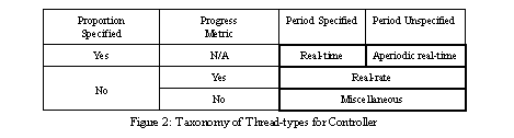The applications use some form of bounded buffer to communicate, such as a shared-memory queue, unix-style pipe, or sockets. Pipes and sockets are effectively queues managed by the kernel as part of the abstraction. By exposing the fill-level, size, and role of the application (producer or consumer), the scheduler can determine the relative rate of progress of the application by monitoring the fill-level. Servers are essentially the consumer of a bounded buffer, where the producer may or may not be on the same machine. Interactive jobs are servers that listen to ttys instead of sockets. Since interactive jobs have specific requirements (periods relative to human perception), the scheduler only needs to know that the job is interactive and the ttys in which it is interested. Applications that process large data sets can be considered consumers of data that is produced by the I/O subsystem. As such, they need to be given sufficient CPU to keep the disks busy. Using informed prefetching interfaces such as TIP [16] or Dynamic Sets [19] , or delayed write-back buffers for writes, allows the system to monitor the rate of progress of the I/O subsystem as a producer/consumer for a particular job. Some applications are sufficiently unstructured that no suitable symbiotic interface exists, or may be legacy code that predates the interface and cannot be recompiled. In such cases where our scheduler cannot monitor progress, it uses a simple heuristic policy to assign proportion and period based on whether or not the application uses the allocation it is given. When an application initializes a symbiotic interface (such as by submitting hints, opening a file, or opening a shared queue), the interface creates a linkage to the kernel using a meta-interface system call that registers the queue (or socket, etc.) and the application's use of that queue (producer or consumer). We have implemented a shared-queue library that performs this linkage automatically, and have extended the in-kernel pipe and socket implementation to provide this linkage. Adaptive ControllerGiven the dispatcher and monitoring components, the job of the scheduler is to assign proportion and period to ensure that applications make reasonable progress. See : Taxonomy of Thread-types for Controller. presents the four cases considered by the controller: real-time, aperiodic real-time, real-rate, and miscellaneous threads. Real-time threads specify both proportion and period, aperiodic real-time threads specify proportion only, real-rate do not specify proportion or period but supply a metric of progress, and miscellaneous threads provide no information at all. ![]()