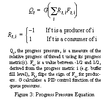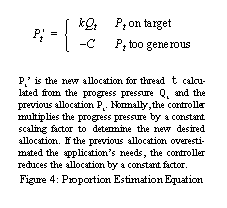 We call threads that have a visible metric of progress but are without a known proportion or period real-rate since they do not have hard deadlines but do have throughput requirements. Examples of real-rate threads are multimedia pipelines, isochronous device drivers, and servers. During each controller interval, the controller samples the progress of each thread to determine the pressure exerted on the thread. Pressure is a number between -1/2 and 1/2; negative values indicate too much progress is being made and the allocation should be reduced, 0 indicates ideal allocation, and positive values indicate the thread is falling behind and needs more CPU. The magnitude of the pressure is relative to how far behind or ahead the thread is running. See : Progress Pressure Equation. contains the formula used by the controller to calculate the total pressure on a thread from its progress metrics, or input/output queues. For shared queues, Ft,i is calculated by dividing the current fill-level by the size of the queue and subtracting 1/2. We use 1/2 (Ft,i = 0) as the optimal fill level since it leaves maximal room to handle bursts by both the producer and consumer. Rt,i is used to flip the sign on the queue, since a full queue means the consumer should speed up (positive pressure) while the producer should slow down (negative pressure). The individual progress pressures are then summed and passed to a proportional-integral-derivative (PID) control to calculate a cumulative pressure, Qt. A PID controller combines the magnitude of the summed pressures (P) with the integral (I) and with the first-derivative (D) of the function described by the summed progress pressures over time. PID control is a commonly applied technique for building controllers to provide error reduction together with acceptable stability and damping [5]. ![]()