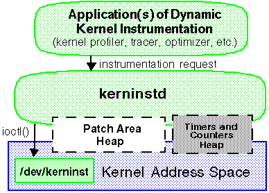 Code patches, which hold the dynamically generated code being inserted, are allocated from the patch area heap in the kernel's address space. Kerninstd cannot allocate kernel memory, so it has /dev/kerninst perform the necessary kmem_alloc via an ioctl.