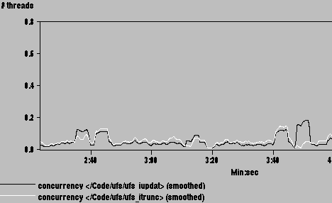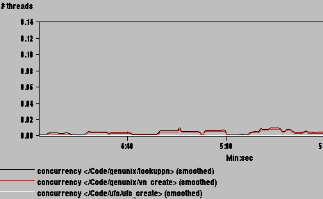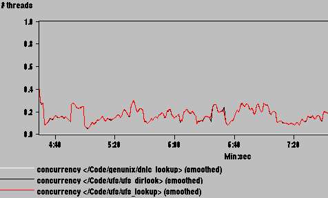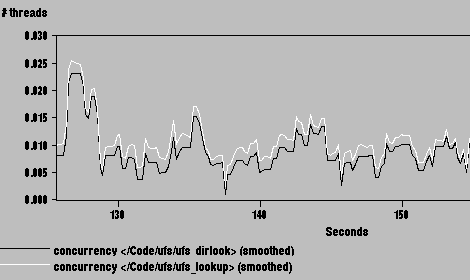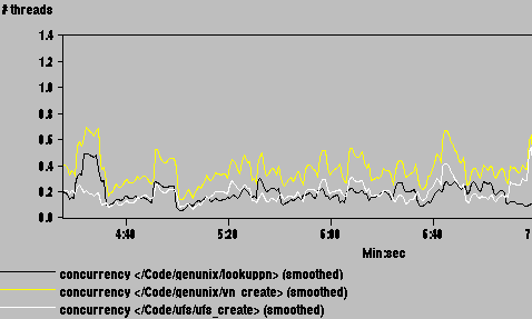 Performance metrics are formed by applying the primitives. Four metrics in our tool-kit library are call counts, average number of executing threads, average number of waiting threads, and virtual timers. Call counts simply record the number of times a function is called. The "calls made to" curve in Figure 11 shows an example of the number of calls to the kernel function copen. Average number of executing threads uses a counter to record the number of threads in a section of code (incremented at entry to the block and decremented at exit) and a value recording the last time the value being averaged has changed; the AOT is calculated using these values. The "concurrency" curve in Figure 11 shows an example of the average number of threads in function copen. Average waiting threads counts the number of threads waiting on a kernel mutex variable (kmutex_t), by instrumenting mutex_enter; the AOT primitive is applied to this counter. The underlying processor cycle counters used by KernInst measure elapsed (wall) time. Virtual (processor) time can be important in trying to isolate bottlenecks. KernInst measures virtual time by instrumenting the context switch handler; we can detect when a kernel thread is dispatched, and stop and re-start the timer primitive at the appropriate times.